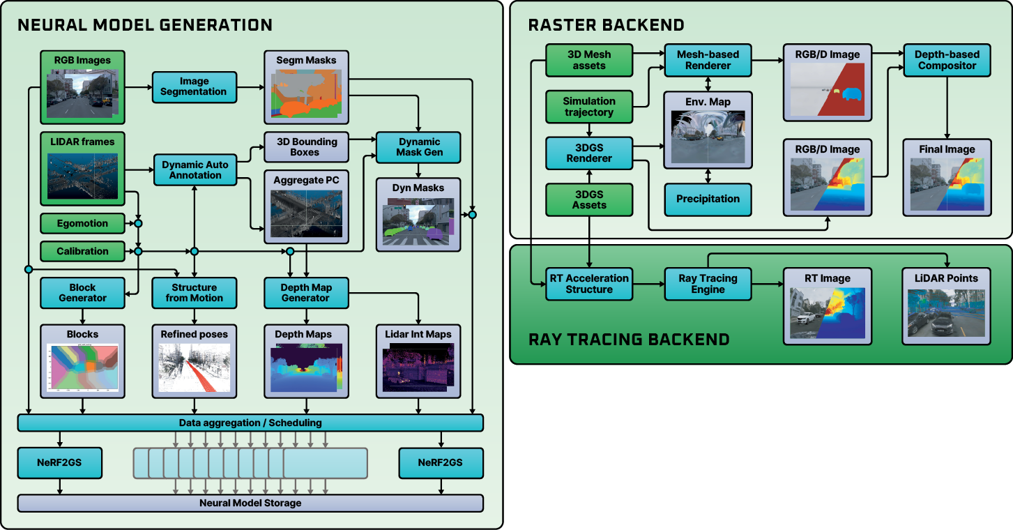 We train our 3D Gaussian Splatting (3DGS) and NeRF-based models using synchronized data collected from vehicles equipped with RGB cameras, GNSS devices, and LiDAR sensors. The reconstructed environment allows for the virtual placement of dynamic agents at arbitrary locations, adjustments to environmental conditions, and rendering from novel camera viewpoints. We have significantly improved novel view synthesis quality—particularly for road surfaces and lane markings—by incorporating surface normal regularization, which enhances its applicability for autonomous driving tasks. Additionally, our method supports multiple sensor modalities (LiDAR, radar target lists), different camera models (e.g., fisheye), and accounts for camera exposure mismatches. It can also predict segmentation masks, surface normals, and depth maps. Our simulator has been validated through downstream tasks, HiL experiments, and closed-loop ADAS/AD tests.