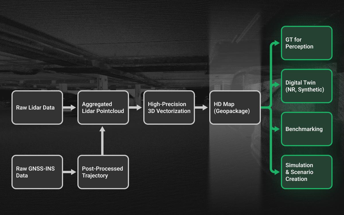 In many projects, HD map creation is one step in an end-to-end pipeline. We can support the full workflow from planning and recording through point cloud processing, vector HD map creation, simulation map build, neural reconstruction, and metrics-based evaluation. In this context, the output can be viewed as a digital-twin pipeline: from real-world capture to a simulation-ready, measurable environment.