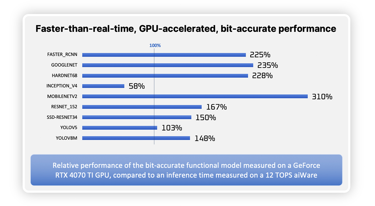 aiWare is aiMotive’s proprietary NPU IP, optimized for automotive-grade AI inference. To ensure that AI models behave consistently from cloud training to in-vehicle deployment, we developed a **GPU-accelerated, bit-accurate aiWare functional model**. This model enables: